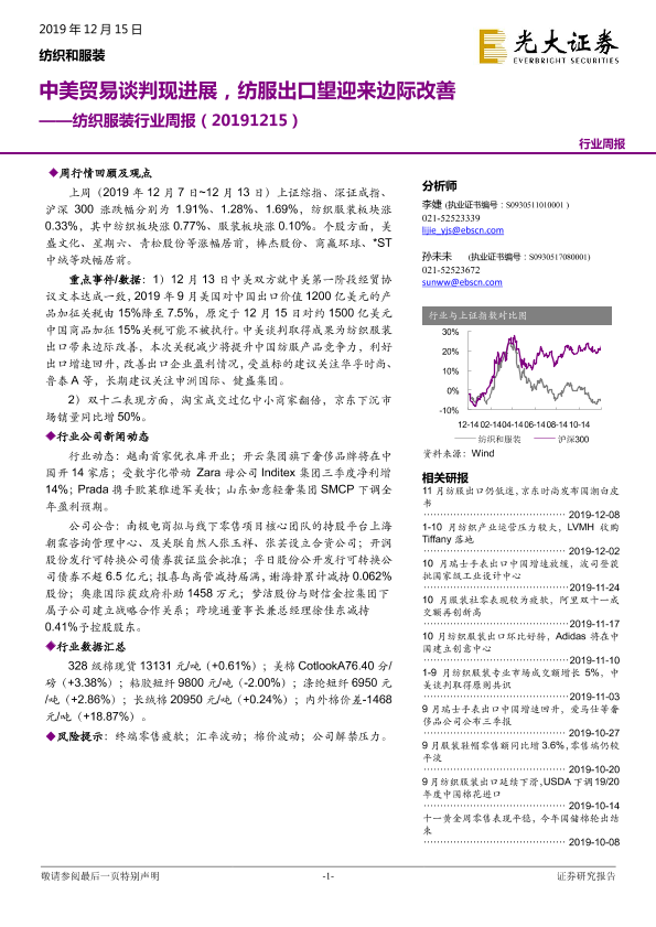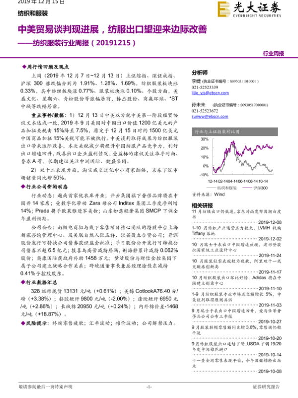 【光大证券】【20191215】20191215-光大证券-纺织服装行业周报:中美贸易谈判现进展,纺服出口望迎来边际改善-17页
