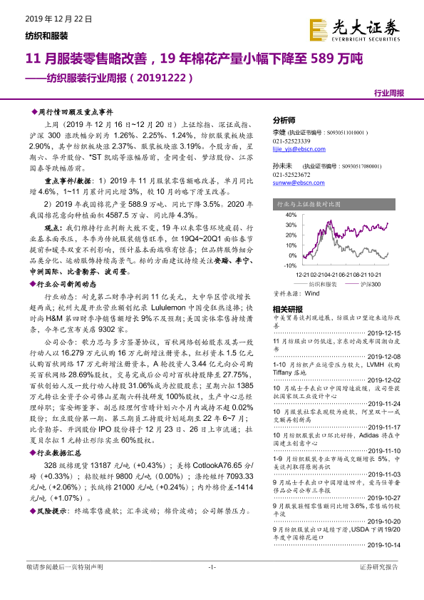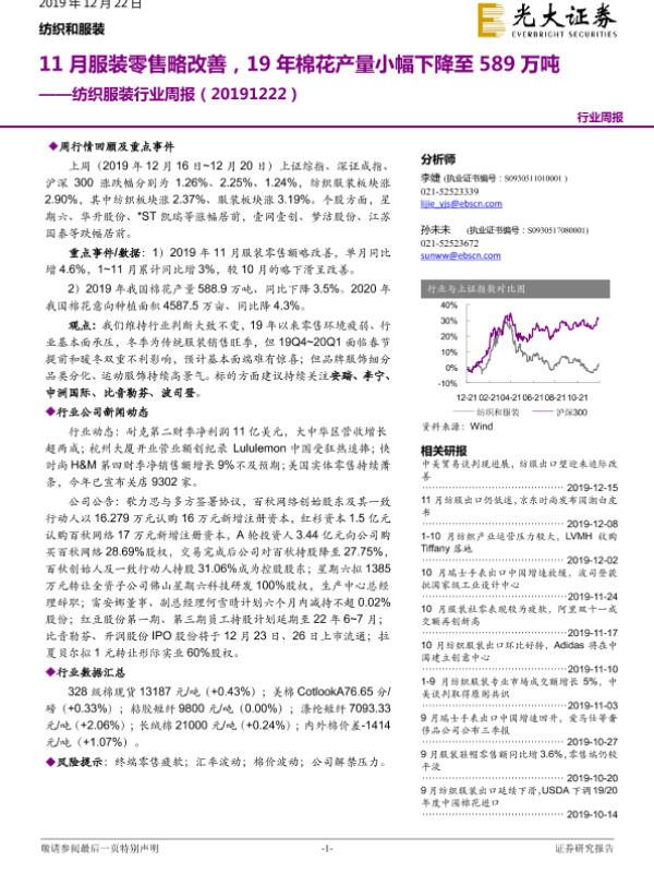 【光大证券】【20191222】20191222-光大证券-纺织服装行业周报:11月服装零售略改善,19年棉花产量小幅下降至589万吨-17页