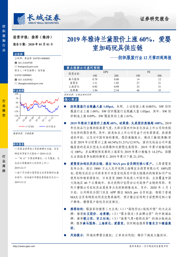 【长城证券】【20200101】20200101-长城证券-纺织服装行业12月第四周周报:2019年雅诗兰黛股价上涨60%,爱婴室加码玩具供应链-22页
