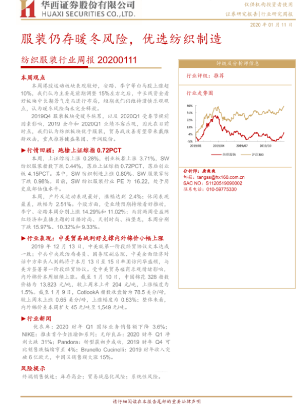 【华西证券】【20200111】纺织服装行业周报:服装仍存暖冬风险,优选纺织制造-14页