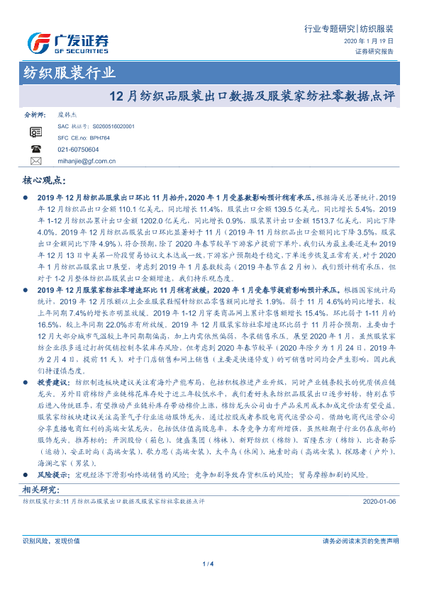 【广发证券】【20200119】12月纺织品服装出口数据及服装家纺社零数据点评-4页