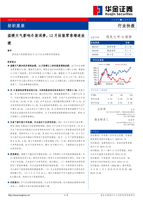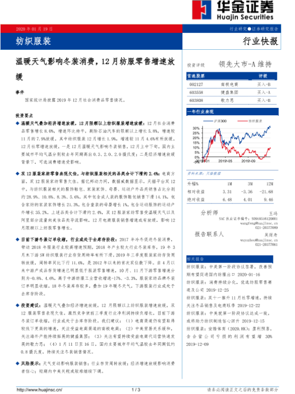 【华金证券】【20200119】纺织服装行业快报:温暖天气影响冬装消费,12月纺服零售增速放缓-3页