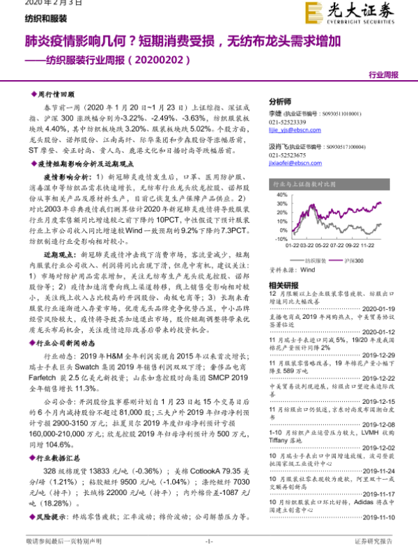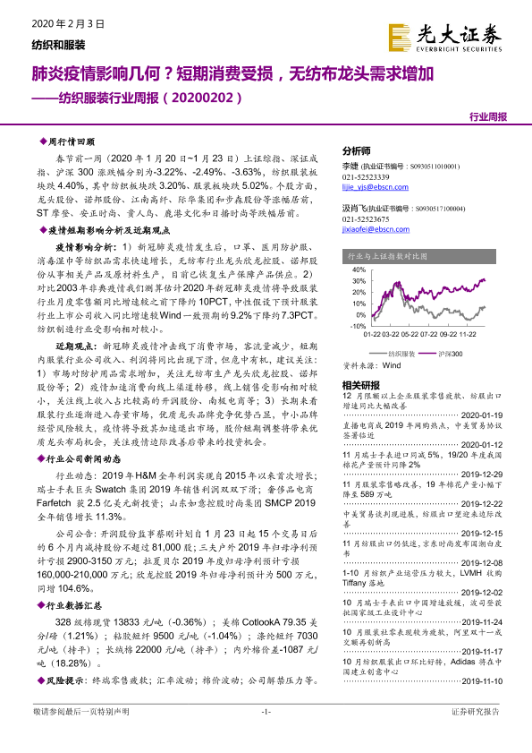 【光大证券】【20200203】纺织服装行业周报:肺炎疫情影响几何?短期消费受损,无纺布龙头需求增加-17页