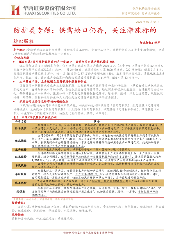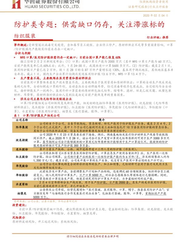 【华西证券】【20200204】纺织服装:防护类专题:供需缺口仍存,关注滞涨标的-4页