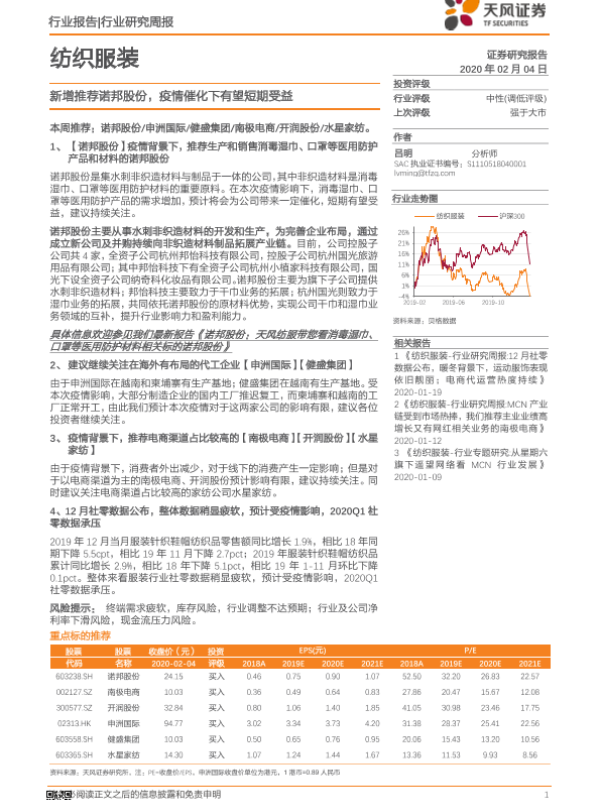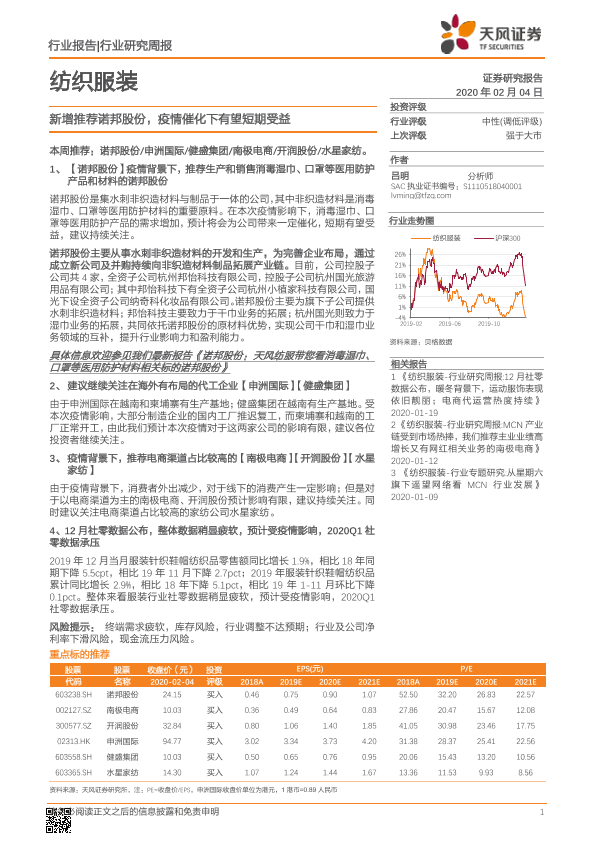 【天风证券】【20200204】20200204-天风证券-纺织服装行业研究周报:新增推荐诺邦股份,疫情催化下有望短期受益-15页