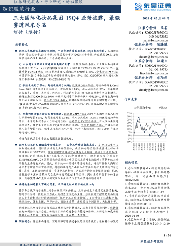 【东吴证券】【20200209】纺织服装行业跟踪周报:三大国际化妆品集团19Q4业绩披露,最强赛道风采尽显-26页