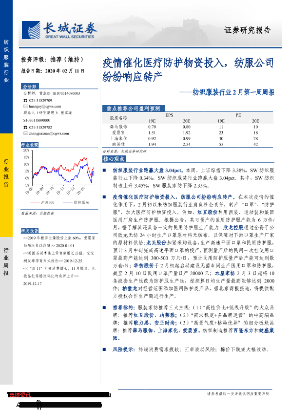 【长城证券】【20200211】20200211-长城证券-纺织服装行业2月第一周周报:疫情催化医疗防护物资投入,纺服公司纷纷响应转产-21页