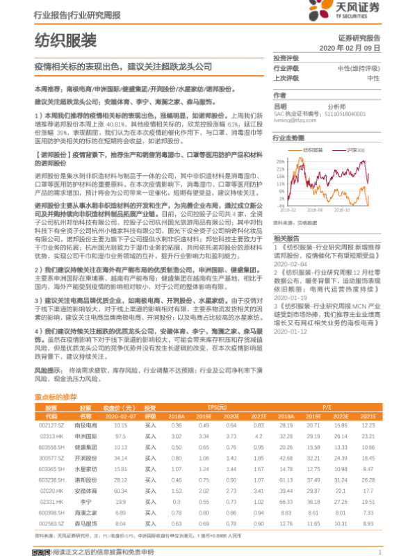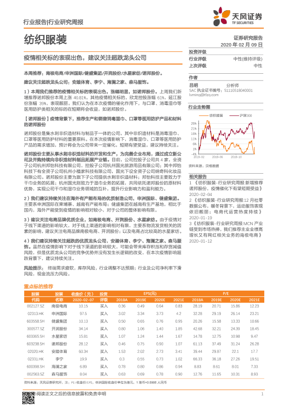【天风证券】【20200209】20200209-天风证券-纺织服装行业研究周报:疫情相关标的表现出色,建议关注超跌龙头公司-16页