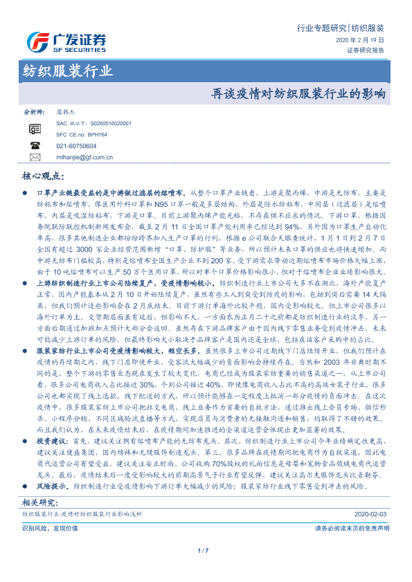 【广发证券】【20200219】20200219-广发证券-纺织服装行业:再谈疫情对纺织服装行业的影响-7页