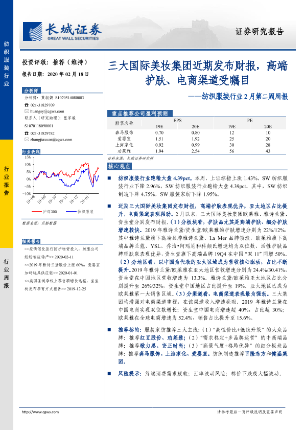 【长城证券】【20200218】20200218-长城证券-纺织服装行业2月第二周周报:三大国际美妆集团近期发布财报,高端护肤、电商渠道受瞩目-21页