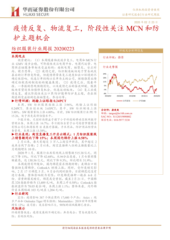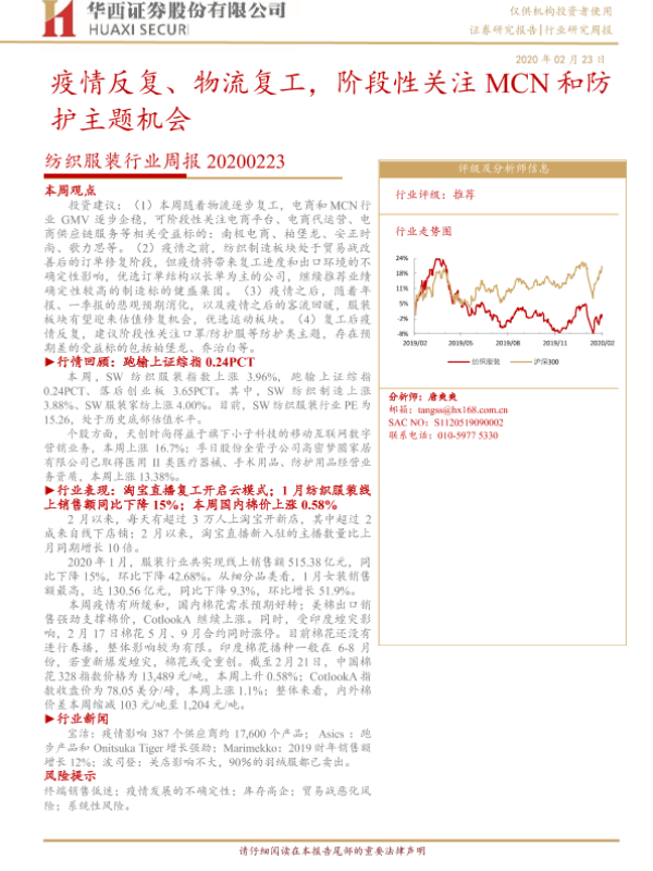 【华西证券】【20200223】20200223-华西证券-纺织服装行业周报:疫情反复、物流复工,阶段性关注MCN和防护主题机会-17页