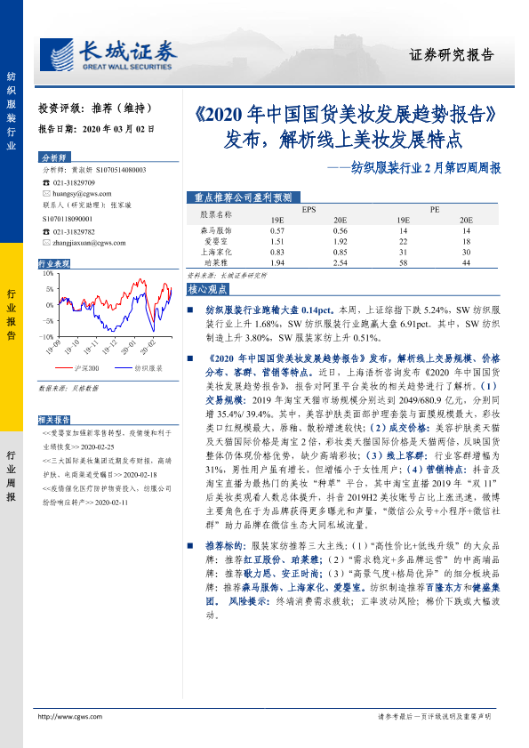 【长城证券】【20200302】20200302-长城证券-纺织服装行业2月第四周周报:《2020年中国国货美妆发展趋势报告》发布,解析线上美妆发展特点-21页
