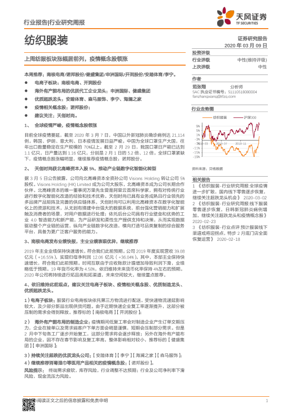 【天风证券】【20200309】上周纺服板块涨幅居前列,疫情概念股领涨-14页