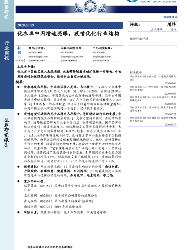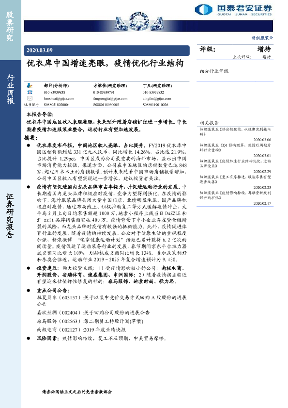 【国泰君安证券】【20200309】20200309-国泰君安-纺织服装行业周报:优衣库中国增速亮眼,疫情优化行业结构-23页