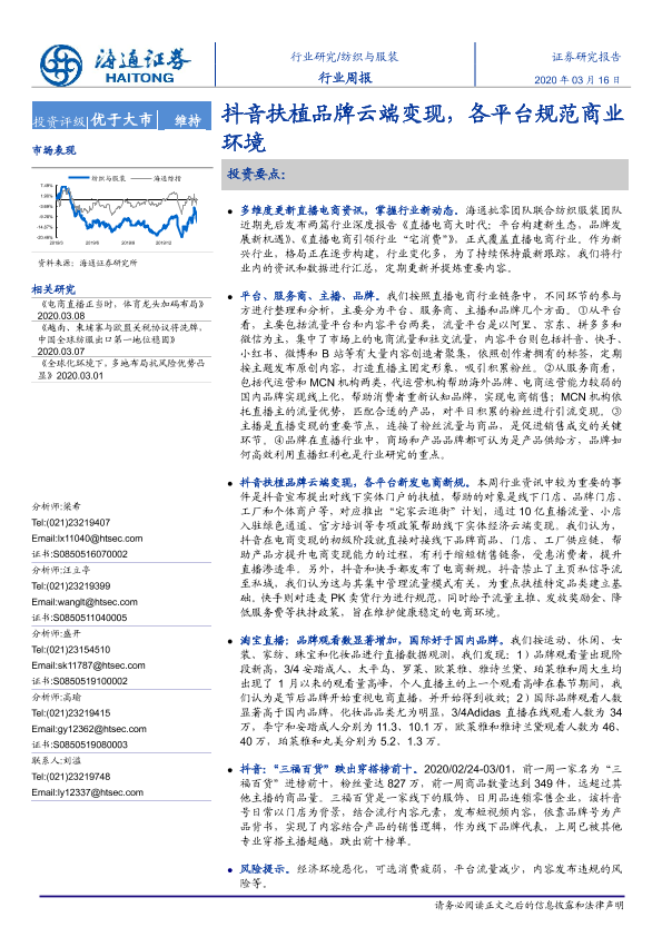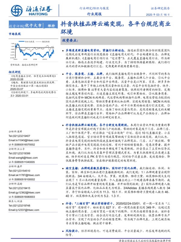 【海通证券】【20200316】20200316-海通证券-纺织与服装行业周报:抖音扶植品牌云端变现,各平台规范商业环境-11页