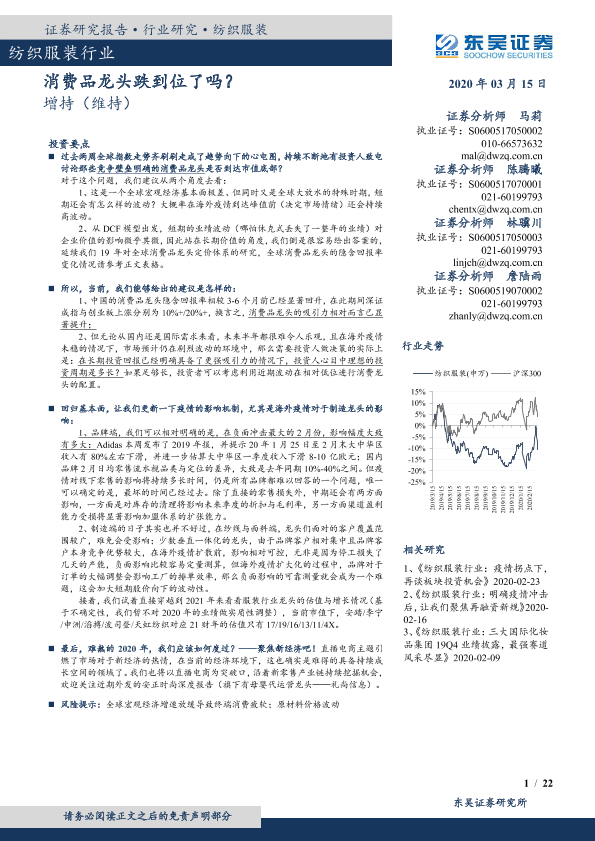 【东吴证券】【20200315】纺织服装行业:消费品龙头跌到位了吗?-22页
