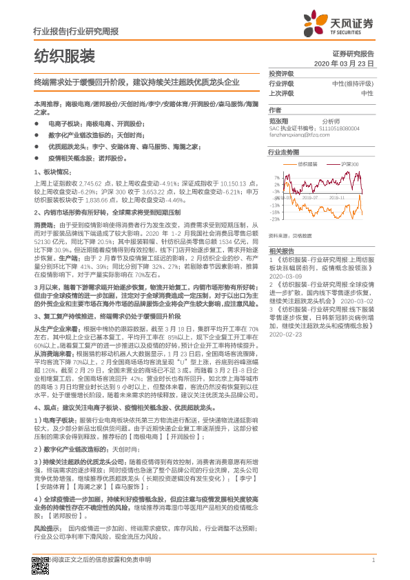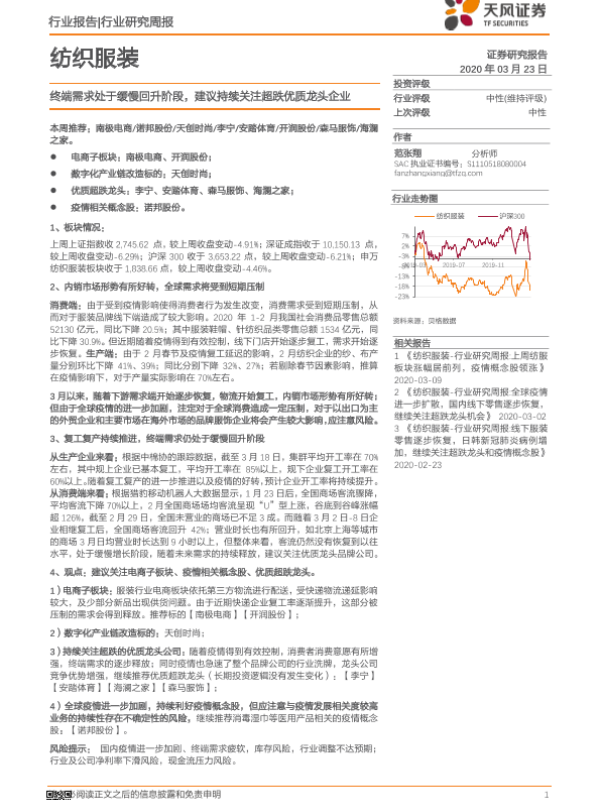 【天风证券】【20200323】20200323-天风证券-纺织服装行业研究周报:终端需求处于缓慢回升阶段,建议持续关注超跌优质龙头企业-15页