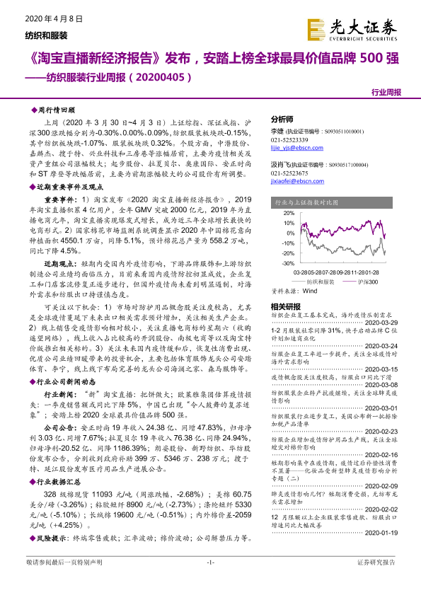 【光大证券】【20200408】20200408-光大证券-纺织服装行业周报:《淘宝直播新经济报告》发布,安踏上榜全球最具价值品牌500强-19页
