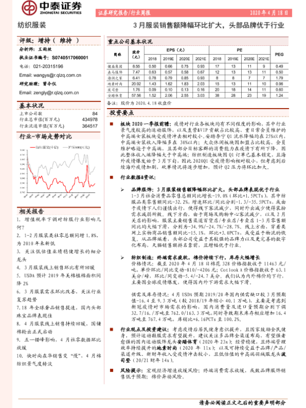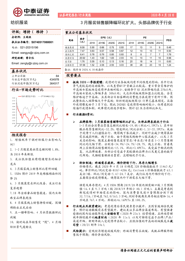 【中泰证券】【20200418】纺织服装行业周报:3月服装销售额降幅环比扩大,头部品牌优于行业-16页