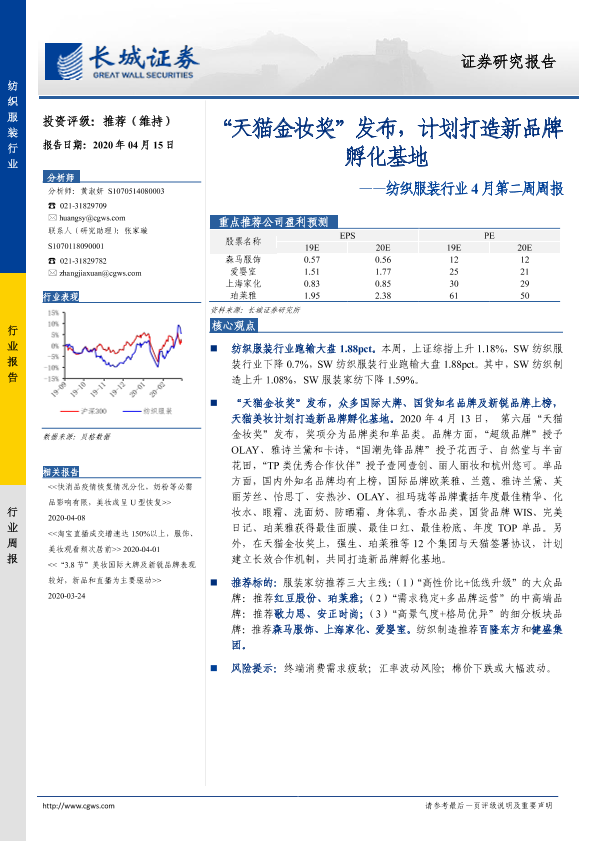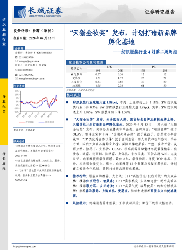 【长城证券】【20200415】20200415-长城证券-纺织服装行业4月第二周周报:“天猫金妆奖”发布,计划打造新品牌孵化基地-21页