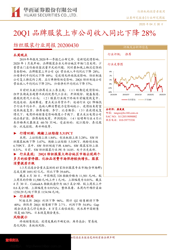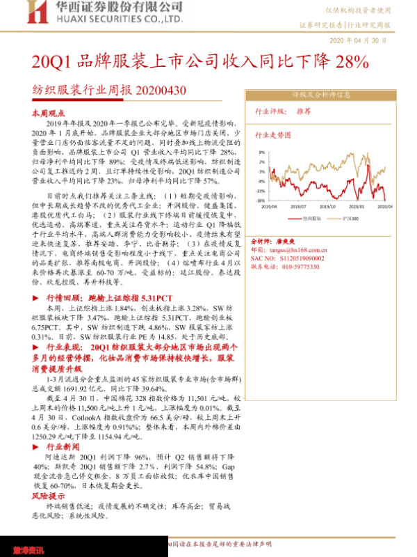 【华西证券】【20200430】20200430-华西证券-纺织服装行业周报:20Q1品牌服装上市公司收入同比下降28%-19页