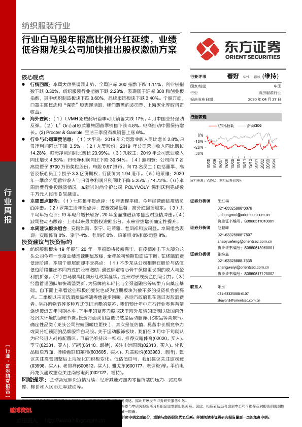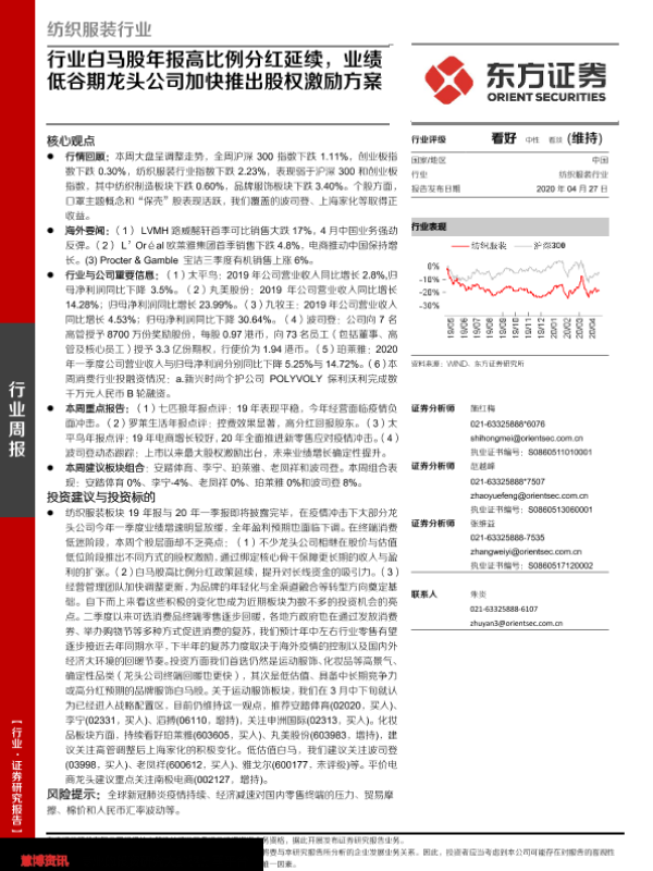 【东方证券】【20200427】纺织服装行业:行业白马股年报高比例分红延续,业绩低谷期龙头公司加快推出股权激励方案-12页