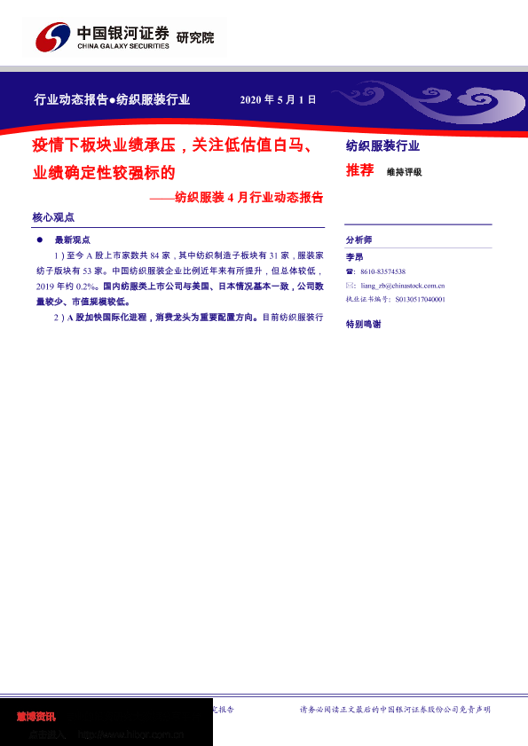 【银河证券】【20200501】20200501-中国银河-纺织服装4月行业动态报告:疫情下板块业绩承压,关注低估值白马、业绩确定性较强标的-40页
