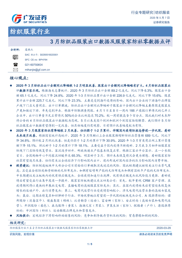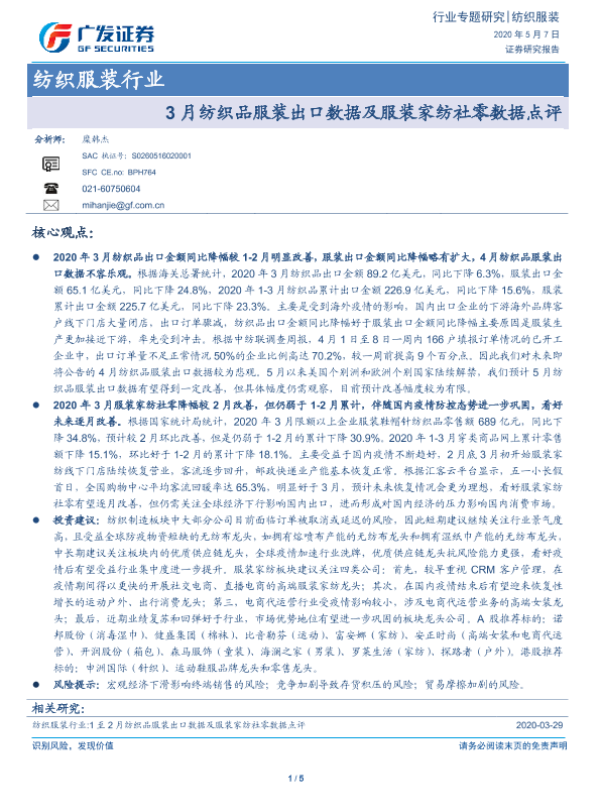 【广发证券】【20200507】3月纺织品服装出口数据及服装家纺社零数据点评-5页