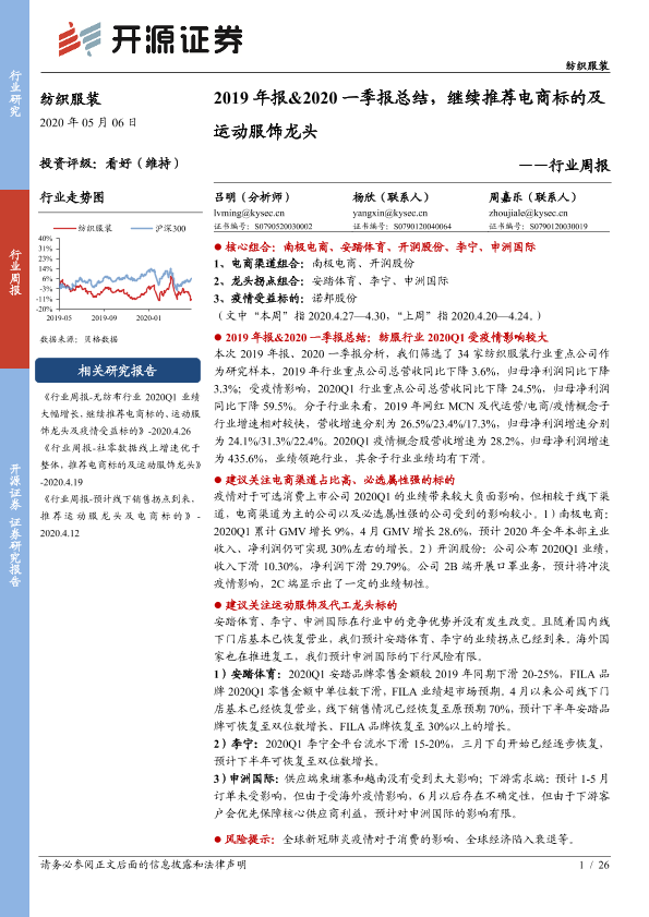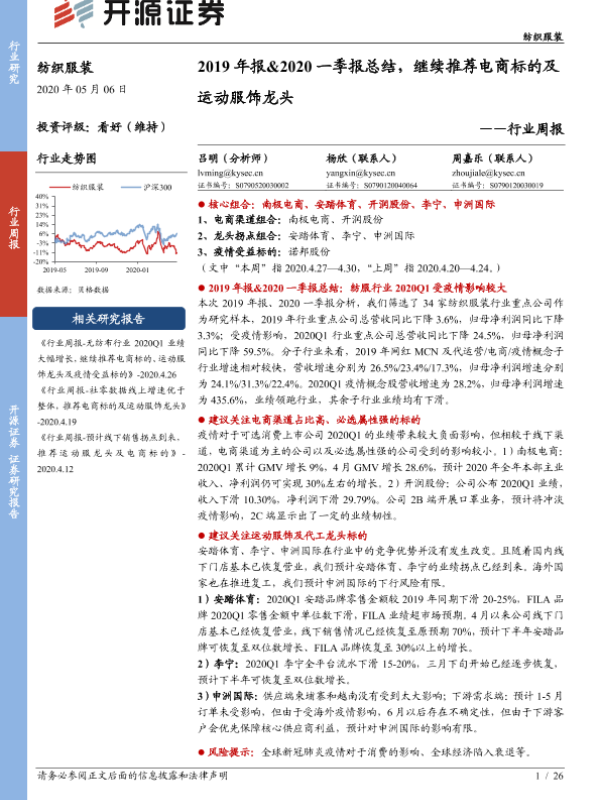 【开源证券】【20200506】20200506-开源证券-纺织服装行业周报:2019年报&2020一季报总结,继续推荐电商标的及运动服饰龙头-26页