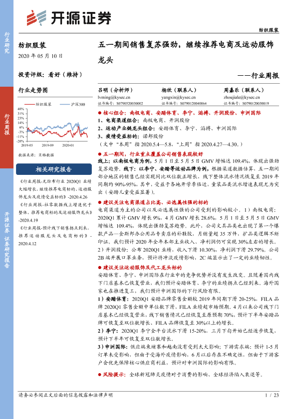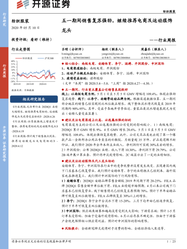 【开源证券】【20200510】20200510-开源证券-纺织服装行业周报:五一期间销售复苏强劲,继续推荐电商及运动服饰龙头-23页