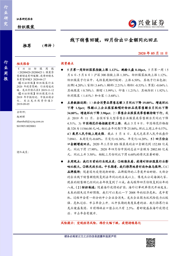 【兴业证券】【20200511】20200511-兴业证券-纺织服装行业周报:线下销售回暖,四月份出口金额同比回正-10页