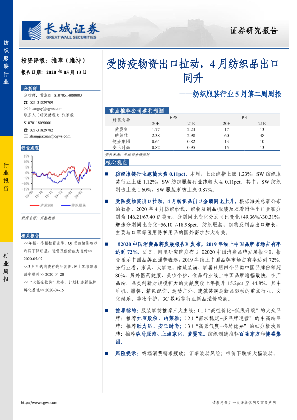 【长城证券】【20200513】纺织服装行业5月第二周周报:受防疫物资出口拉动,4月纺织品出口同升-21页