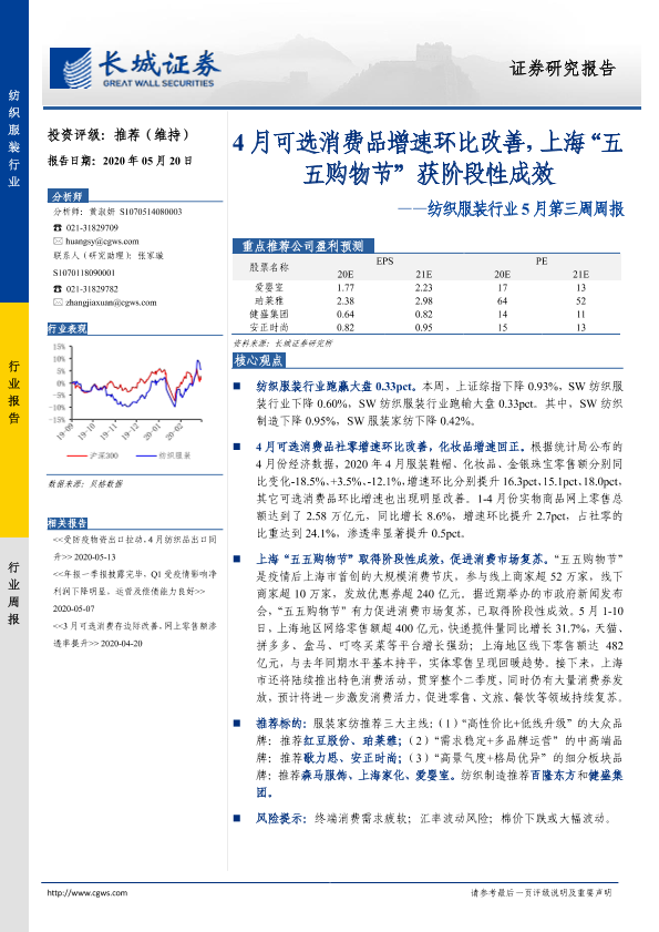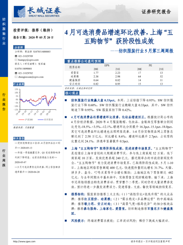 【长城证券】【20200520】纺织服装行业5月第三周周报:4月可选消费品增速环比改善,上海“五五购物节”获阶段性成效-22页