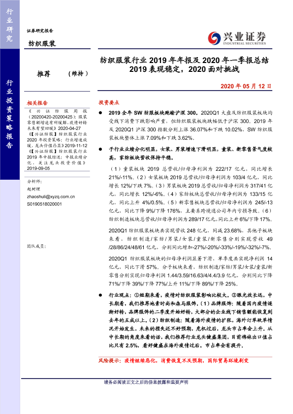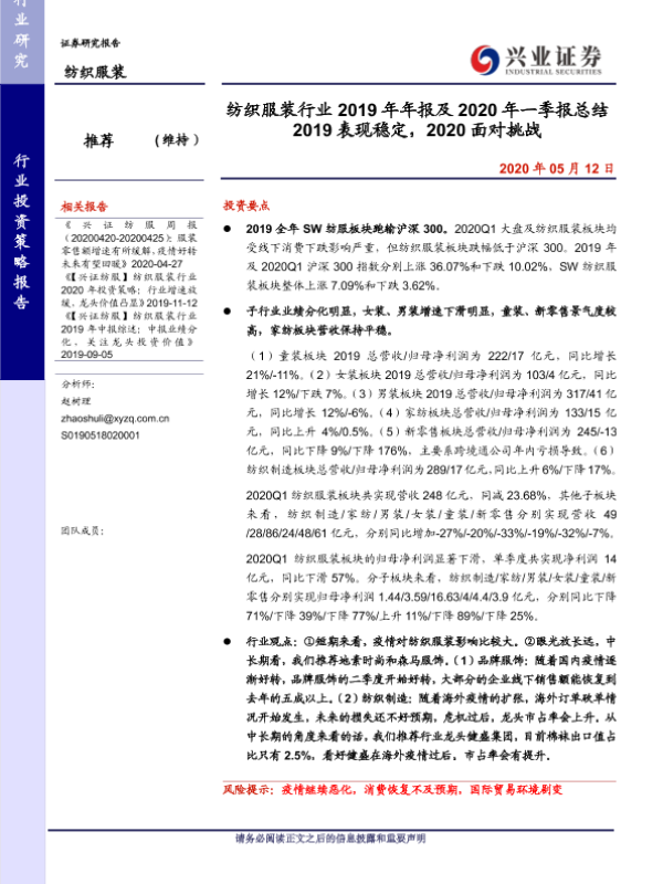【兴业证券】【20200512】纺织服装行业2019年年报及2020年一季报总结:2019表现稳定,2020面对挑战-40页