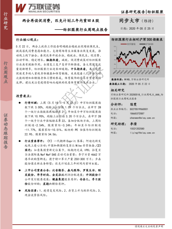 【万联证券】【20200525】纺织服装行业周观点报告:两会再谈促消费,匹克计划三年内重回A股-10页