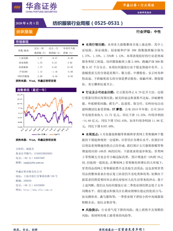 【华鑫证券】【20200601】20200601-华鑫证券-纺织服装行业周报-10页