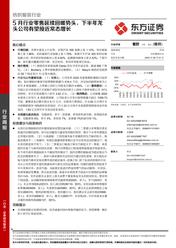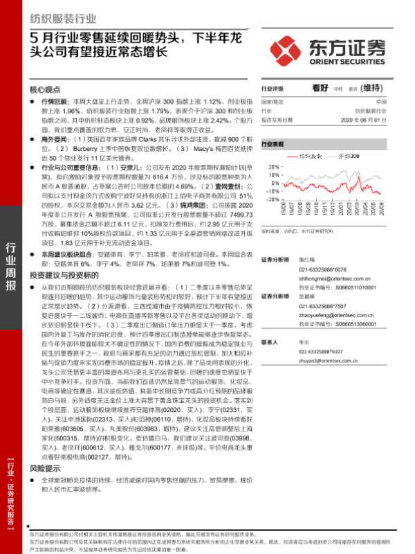 【东方证券】【20200601】纺织服装行业:5月行业零售延续回暖势头,下半年龙头公司有望接近常态增长-11页