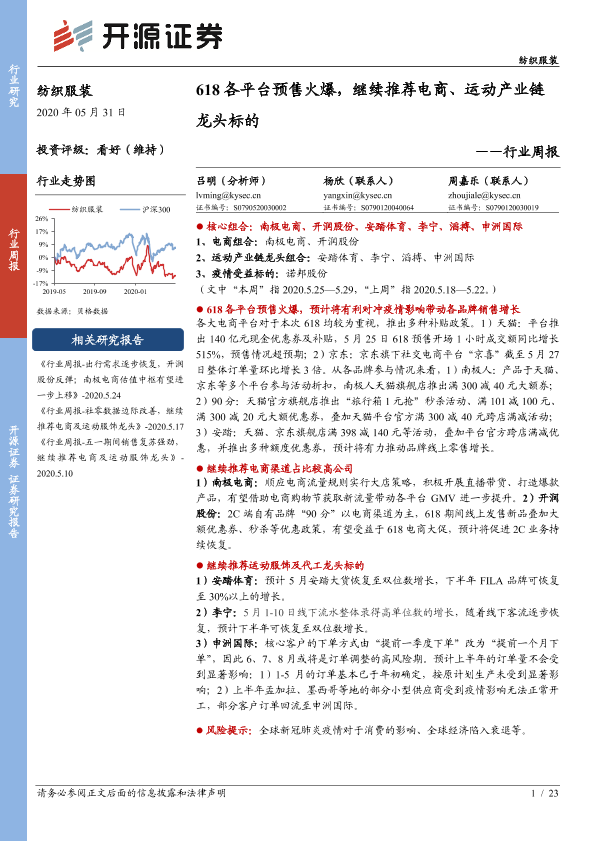 【开源证券】【20200531】20200531-开源证券-纺织服装行业周报:618各平台预售火爆,继续推荐电商、运动产业链龙头标的-23页