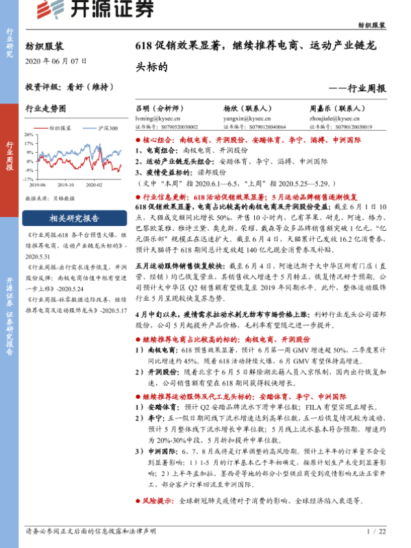 【开源证券】【20200607】20200607-开源证券-纺织服装行业周报:618促销效果显著,继续推荐电商、运动产业链龙头标的-22页