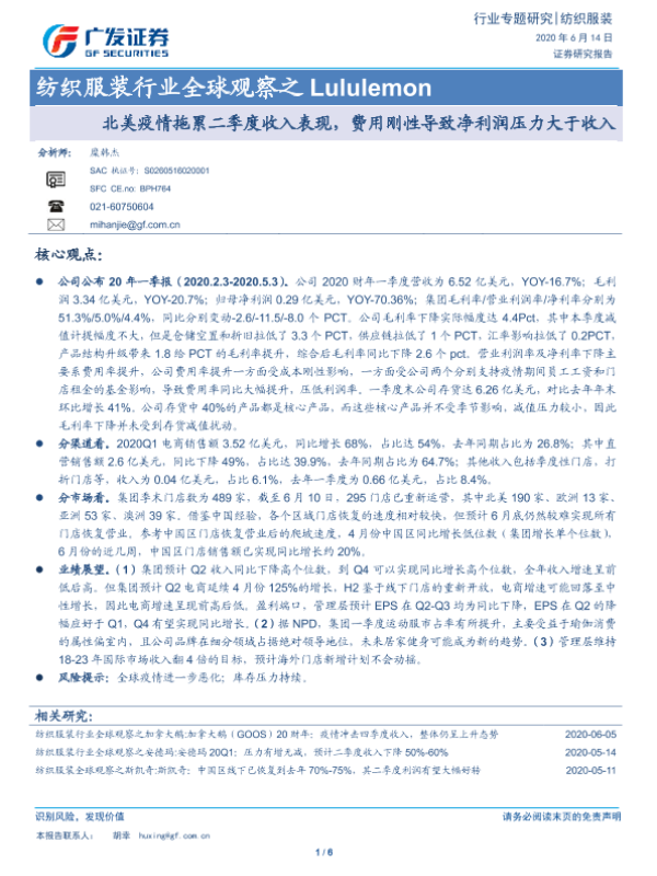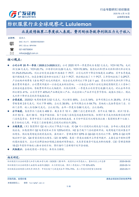 【广发证券】【20200614】纺织服装行业全球观察之 Lululemon:北美疫情拖累二季度收入表现,费用刚性导致净利润压力大于收入-6页