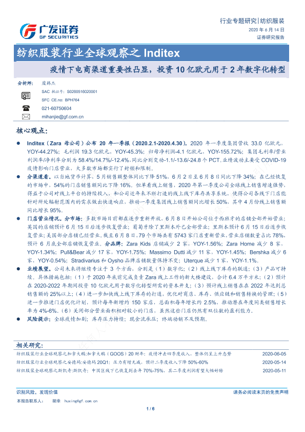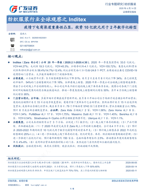 【广发证券】【20200614】纺织服装行业全球观察之Inditex:疫情下电商渠道重要性凸显,投资10亿欧元用于2年数字化转型-6页