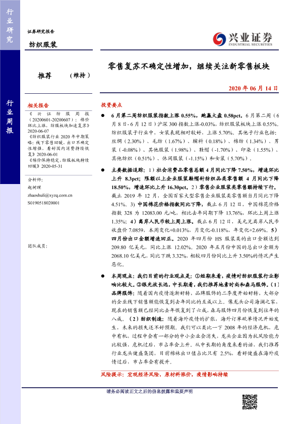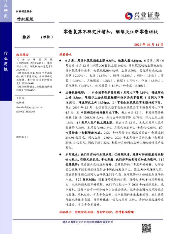 【兴业证券】【20200614】20200614-兴业证券-纺织服装行业周报:零售复苏不确定性增加,继续关注新零售板块-10页