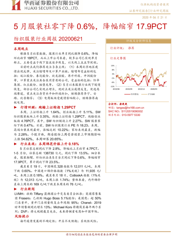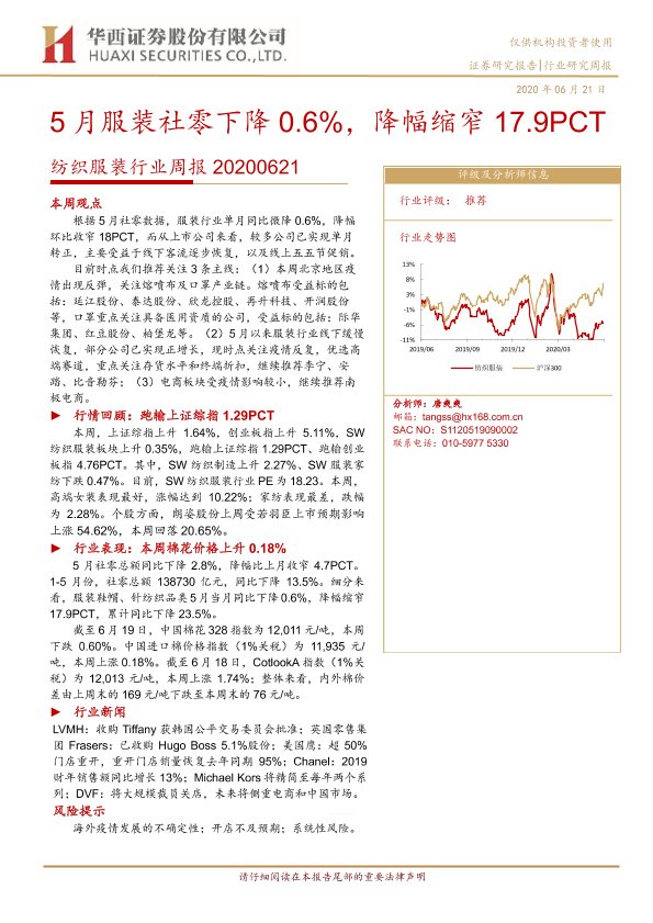 【华西证券】【20200621】20200621-华西证券-纺织服装行业周报:5月服装社零下降0.6%,降幅缩窄17.9PCT-17页