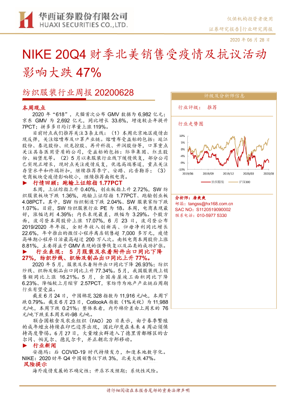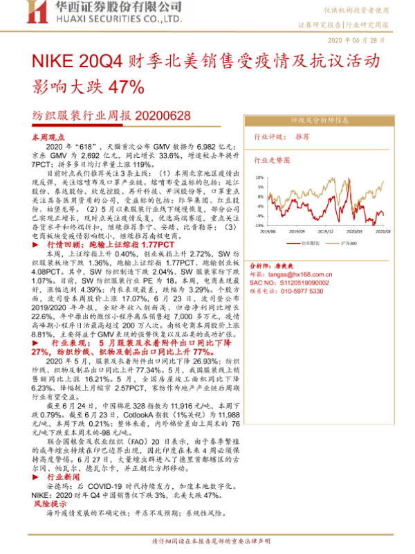【华西证券】【20200628】20200628-华西证券-纺织服装行业周报:NIKE20Q4财季北美销售受疫情及抗议活动影响大跌47%-18页