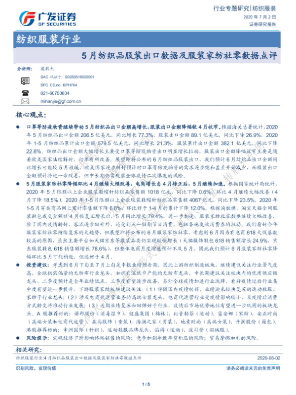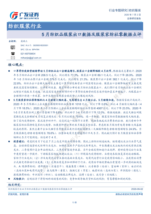 【广发证券】【20200702】20200702-广发证券-纺织服装行业专题研究:5月纺织品服装出口数据及服装家纺社零数据点评-5页