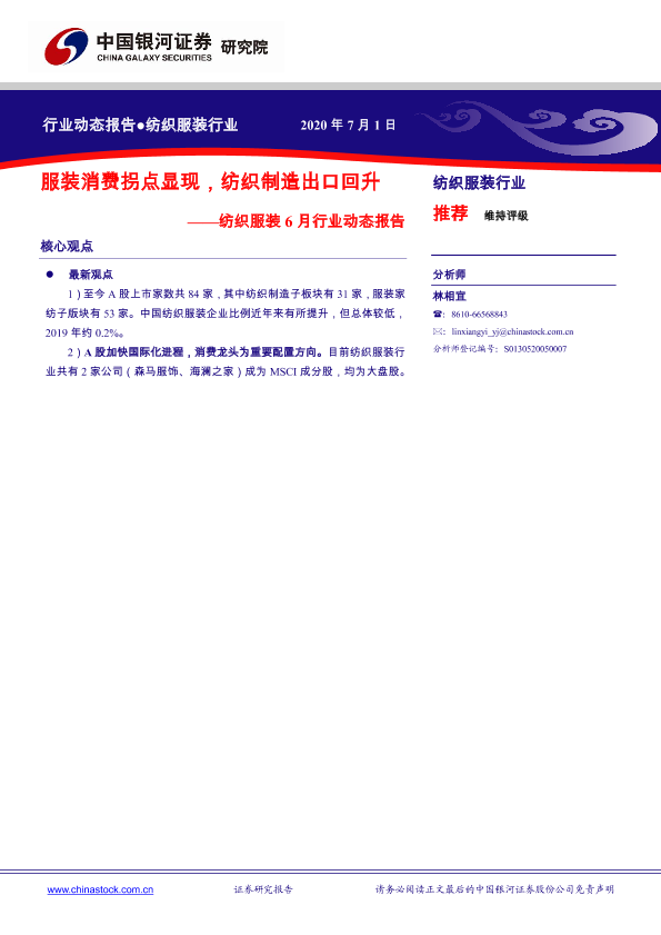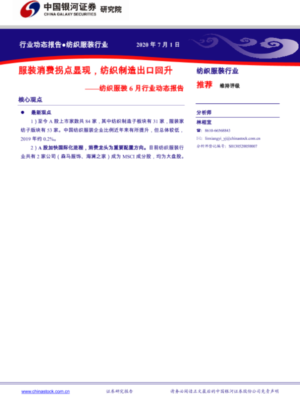 【银河证券】【20200701】20200701-中国银河-纺织服装6月行业动态报告:服装消费拐点显现,纺织制造出口回升-40页