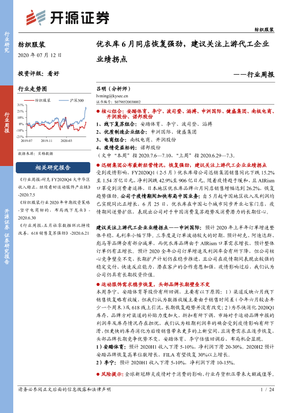 【开源证券】【20200712】20200712-开源证券-纺织服装行业周报:优衣库6月同店恢复强劲,建议关注上游代工企业业绩拐点-24页