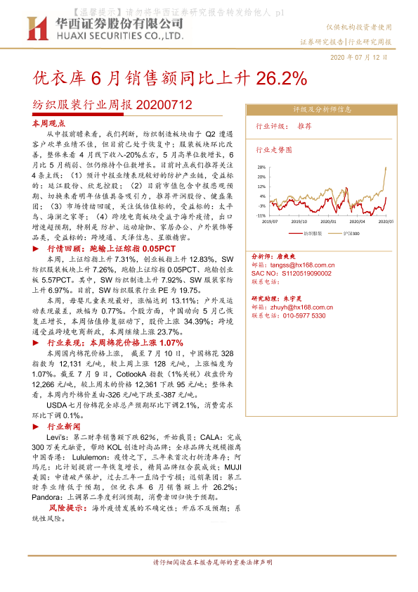 【华西证券】【20200712】20200712-华西证券-纺织服装行业周报:优衣库6月销售额同比上升26.2%-19页