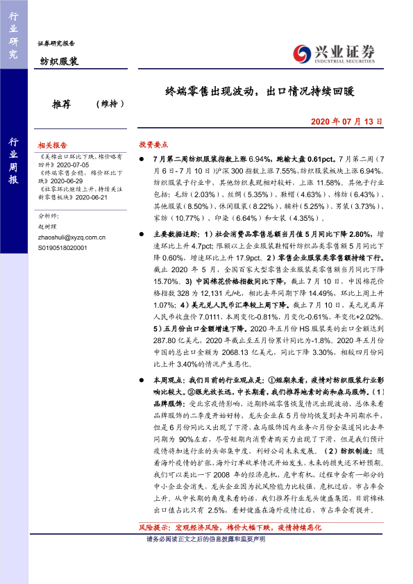 【兴业证券】【20200713】20200713-兴业证券-纺织服装行业周报:终端零售出现波动,出口情况持续回暖-10页