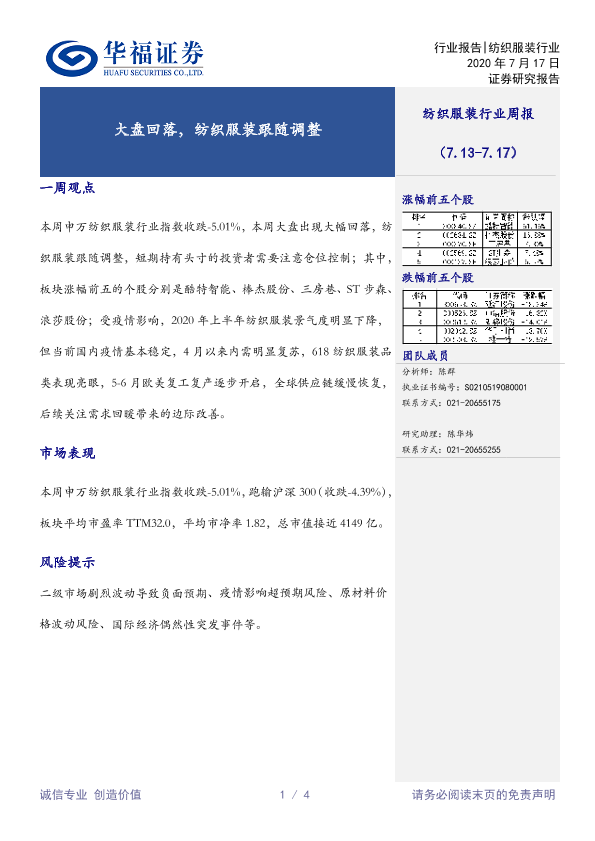 【华福证券】【20200717】20200717-华福证券-纺织服装行业周报:大盘回落,纺织服装跟随调整-4页